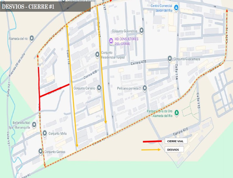 La Alcaldía Distrital de Barranquilla informó que desde este lunes 24 de noviembre inició un cierre temporal en un sector de Alameda del Río, debido a la instalación de nuevas redes de drenaje de aguas lluvias. Las obras, que buscan mejorar el sistema pluvial del sector y prevenir futuras afectaciones por inundaciones, se extenderán hasta el 31 de diciembre.