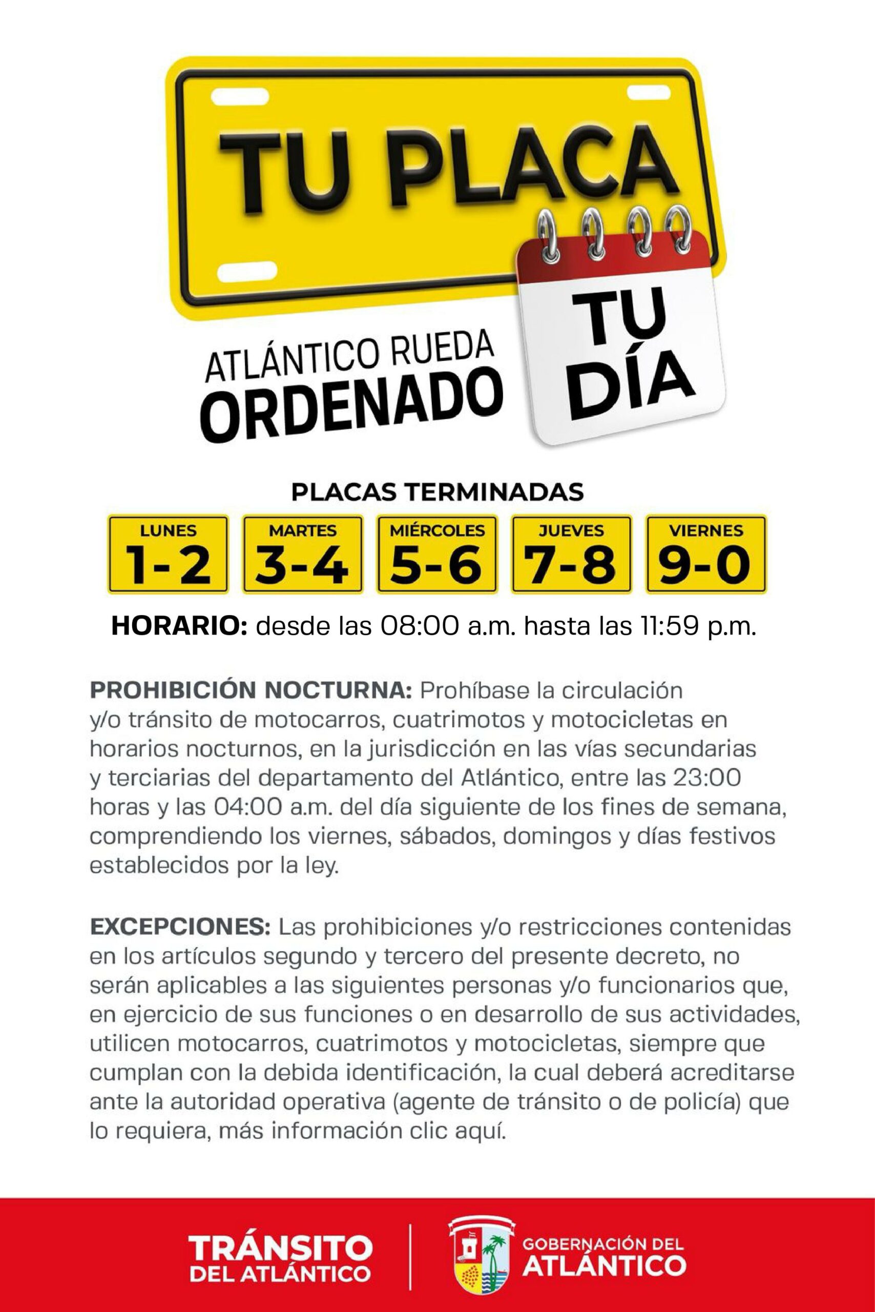 Desde este lunes 1 de diciembre comenzó la fase pedagógica del nuevo pico y placa para motocicletas, motocarros y cuatrimotos en los 20 municipios del Atlántico, a excepción de Soledad, Luruaco y el Distrito de Barranquilla. La medida, adoptada a través del Decreto 000362 expedido por la Gobernación del Atlántico y el Instituto de Tránsito del Atlántico, busca frenar el alarmante aumento de accidentes y mejorar el orden vial en el departamento.