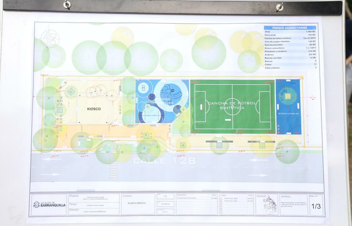 El nuevo parque Ciudad Caribe incluirá una cancha de fútbol sintética, zona de juegos biosaludables, kiosco comunitario, plazoleta central, senderos peatonales, andenes, bancas y salas urbanas. Su diseño se realizó de manera participativa con los residentes, quienes compartieron sus ideas y necesidades durante las mesas de socialización promovidas por la Alcaldía.
