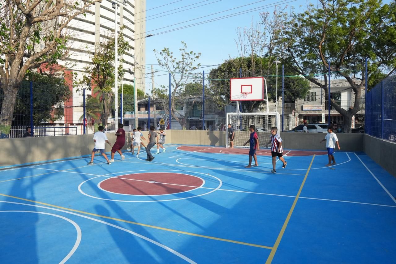 Además, el espacio incluye una cancha múltiple completamente intervenida para la práctica de deportes como fútbol, baloncesto y voleibol. Para garantizar su funcionalidad se realizaron trabajos de reparación en la superficie deportiva, demarcación del campo de juego y la instalación de nuevos marcos deportivos.