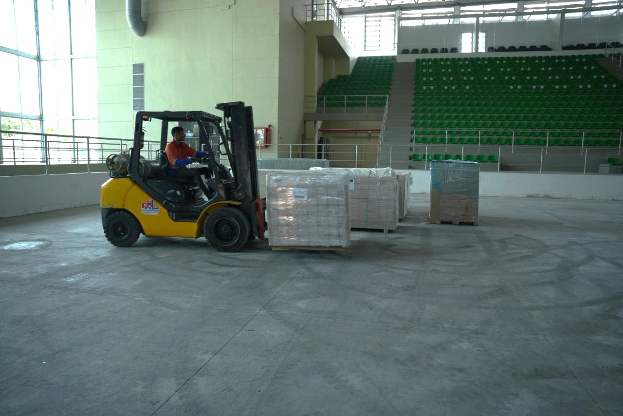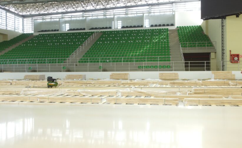 Posteriormente, se dio paso a la recepción del nuevo maderamen, el cual fue sometido a un proceso de aclimatación antes de su instalación, con el fin de asegurar su adaptación a las condiciones ambientales del recinto. De manera paralela, se adelantaron trabajos en la base de concreto, incluyendo la reparación de fisuras y juntas, lo que permitirá garantizar una mayor estabilidad y durabilidad de la nueva superficie.