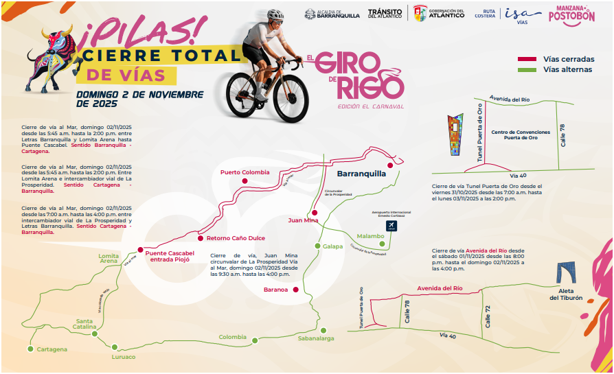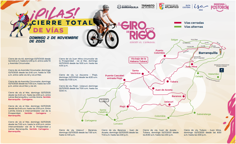 Con el respaldo de las autoridades locales, el Giro de Rigo 2025 contará con cierres viales programados y medidas de seguridad coordinadas para garantizar el desarrollo del evento y la tranquilidad de los asistentes. Barranquilla se alista, una vez más, para demostrar por qué es la ciudad de la alegría, el deporte y la cultura.
