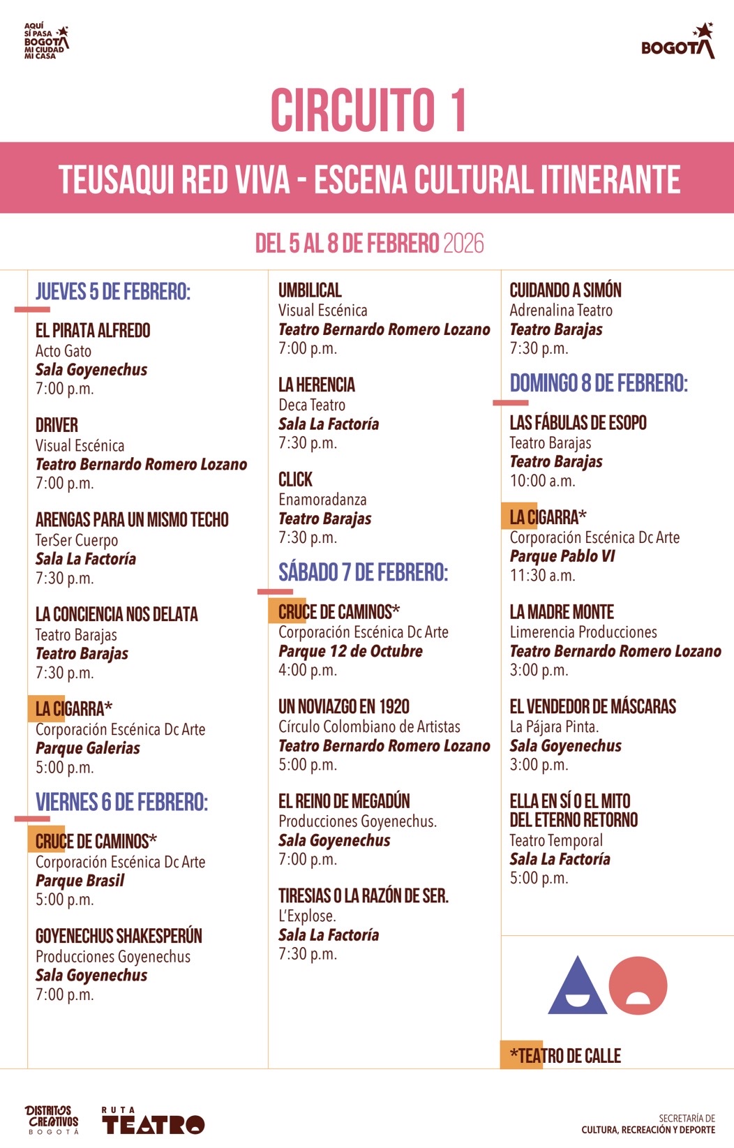 Bogotá vivirá en febrero una experiencia cultural sin precedentes con la llegada de Ruta Teatro, un recorrido vivo por las artes escénicas que tomará distintos escenarios de la ciudad a partir del 5 de febrero de 2026. La iniciativa se desarrollará durante todos los fines de semana del mes en los Distritos Creativos de Teusaquillo y La Candelaria–Santa Fe.