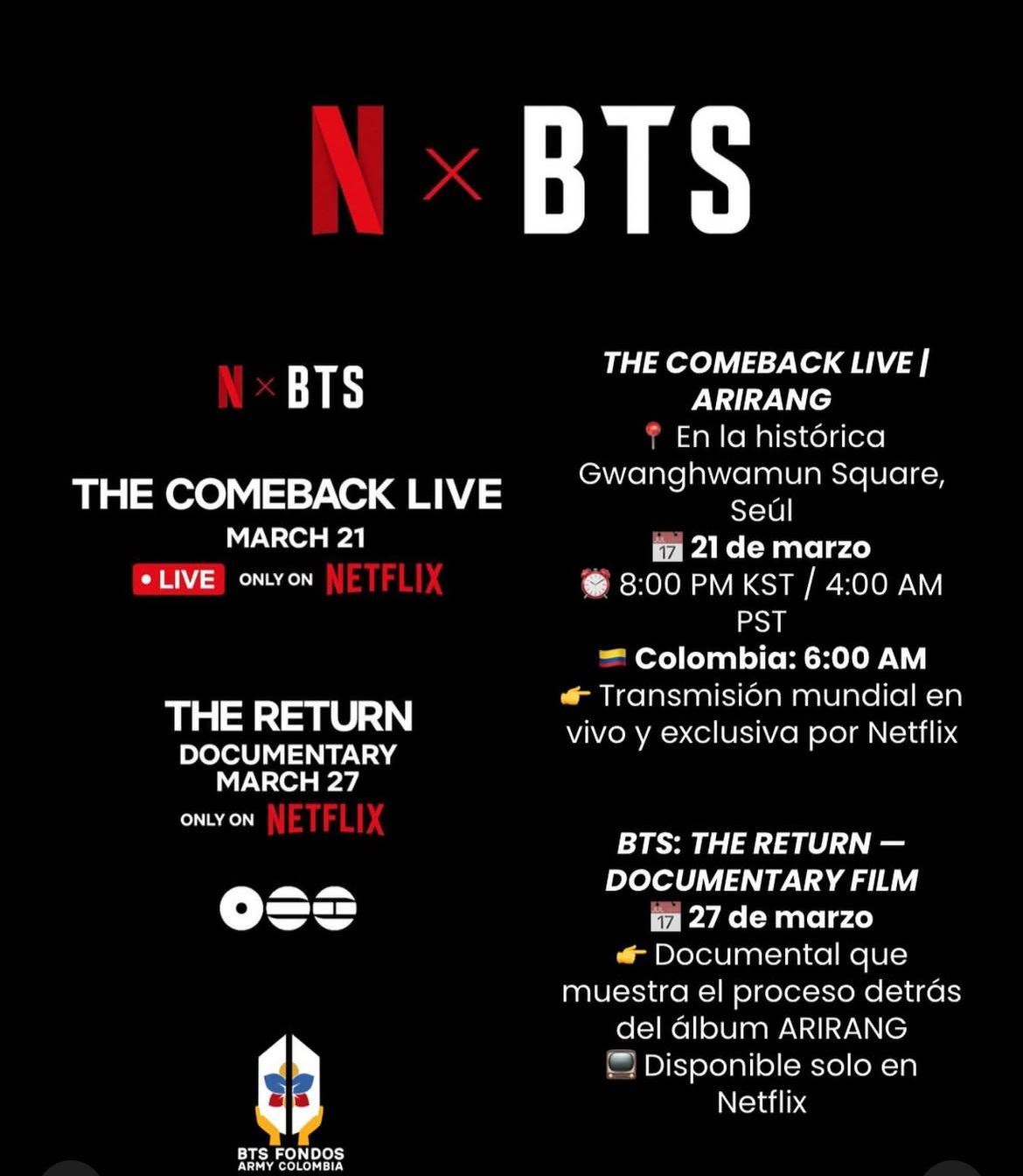 El espectáculo, titulado “BTS: The Comeback Live – ARIRANG”, se realizará el 21 de marzo de 2026 en la plaza Gwanghwamun, en Seúl, y servirá como antesala a su próxima gira mundial. RM, Jin, SUGA, j-hope, Jimin, V y Jung Kook volverán a reunirse sobre el escenario frente a millones de seguidores alrededor del planeta, gracias a la transmisión exclusiva de la plataforma de streaming.
