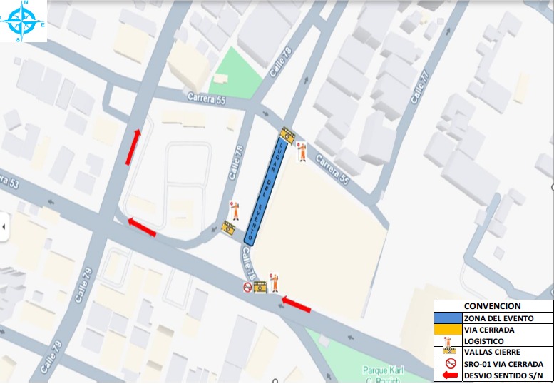 Con motivo del desarrollo del evento cultural Operación Talento, se realizará un cierre total de la calzada oriental de la calle 78 entre las carreras 53 y 55, sentido sur-norte, desde el sábado 2 de agosto a las 6:00 a.m. hasta el lunes 4 de agosto a las 6:00 a.m.