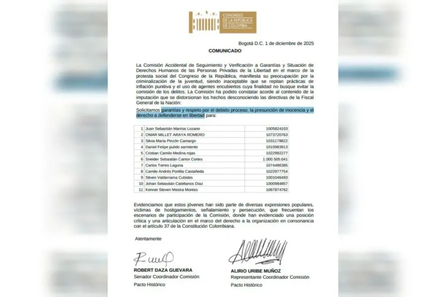 El documento, suscrito entre otros por el senador Iván Cepeda, fue dirigido a distintas instancias del Estado y expresa preocupación por lo que los congresistas califican como una posible criminalización de la juventud. En la misiva, fechada el 1 de diciembre, se hace un llamado a respetar el debido proceso, la presunción de inocencia y el derecho a la defensa en libertad de los capturados, quienes enfrentan cargos por terrorismo, vandalismo sistemático e incendios contra infraestructura pública y privada.