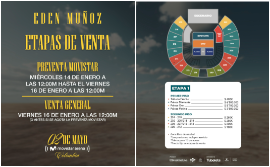 Con esta presentación, Eden Muñoz consolida su crecimiento en Colombia y reafirma el vínculo especial que ha construido con el público del país. Su debut en el Movistar Arena marcará una noche para reencontrarse con canciones que dicen lo que muchas veces cuesta expresar y para celebrar la música latina como un espacio de identidad, evolución y libertad.