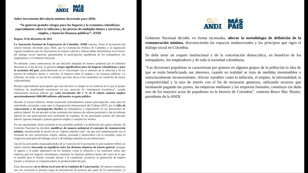 Desde el sector empresarial, la Asociación Nacional de Empresarios de Colombia también expresó su preocupación. En un comunicado, el gremio advirtió que la decisión fue adoptada de manera unilateral y sin una concertación real en la Comisión de Concertación de Políticas Salariales y Laborales. La Andi señaló que el aumento podría presionar la inflación, elevar los costos de bienes y servicios, afectar el empleo y comprometer las finanzas públicas, más aún en un contexto en el que el propio Gobierno declaró una emergencia económica.