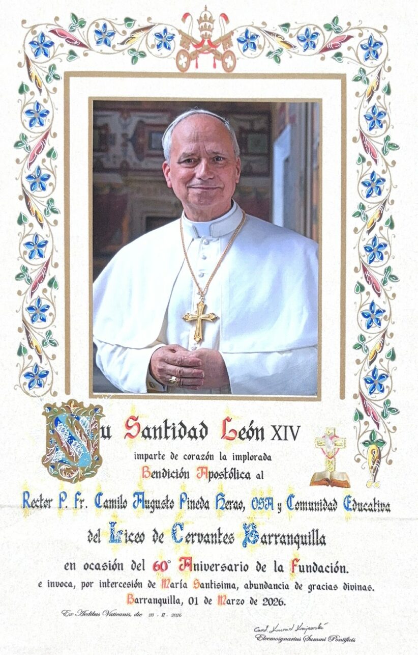 La comunidad educativa del Liceo de Cervantes de Barranquilla, celebra seis décadas de trayectoria formando generaciones de estudiantes en la capital del Atlántico. La conmemoración de sus 60 años estuvo marcada por un hecho significativo: el envío de un pergamino de felicitación por parte de Papa León XIV, (Robert Francis Prevost), quien desde Ciudad del Vaticano hizo llegar un mensaje especial dirigido al rector de la institución, el padre Camilo Pineda. “Es muy bonito porque es una bendición que recae sobre todos nosotros, él reconoce todas las obras, es un Papa muy cercano a nuestra comunidad, referencia a Barranquilla y reconoce a los atlanticenses”, señaló el rector.