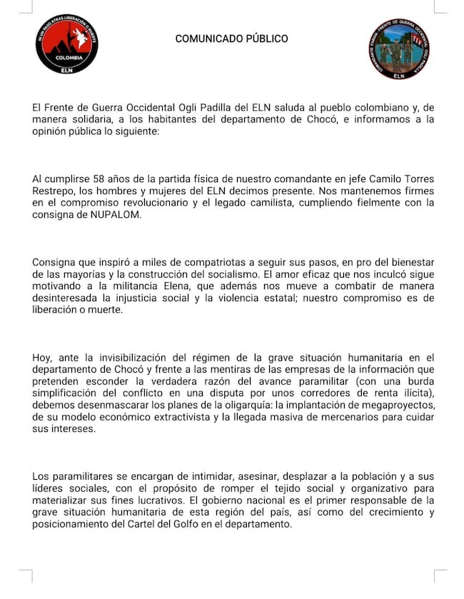 Además, la guerrilla criticó el reciente despliegue de 340 militares y la llegada de un buque de la Armada al departamento, calificando la operación como “publicidad engañosa”, argumentando que no se están realizando acciones reales contra el paramilitarismo.