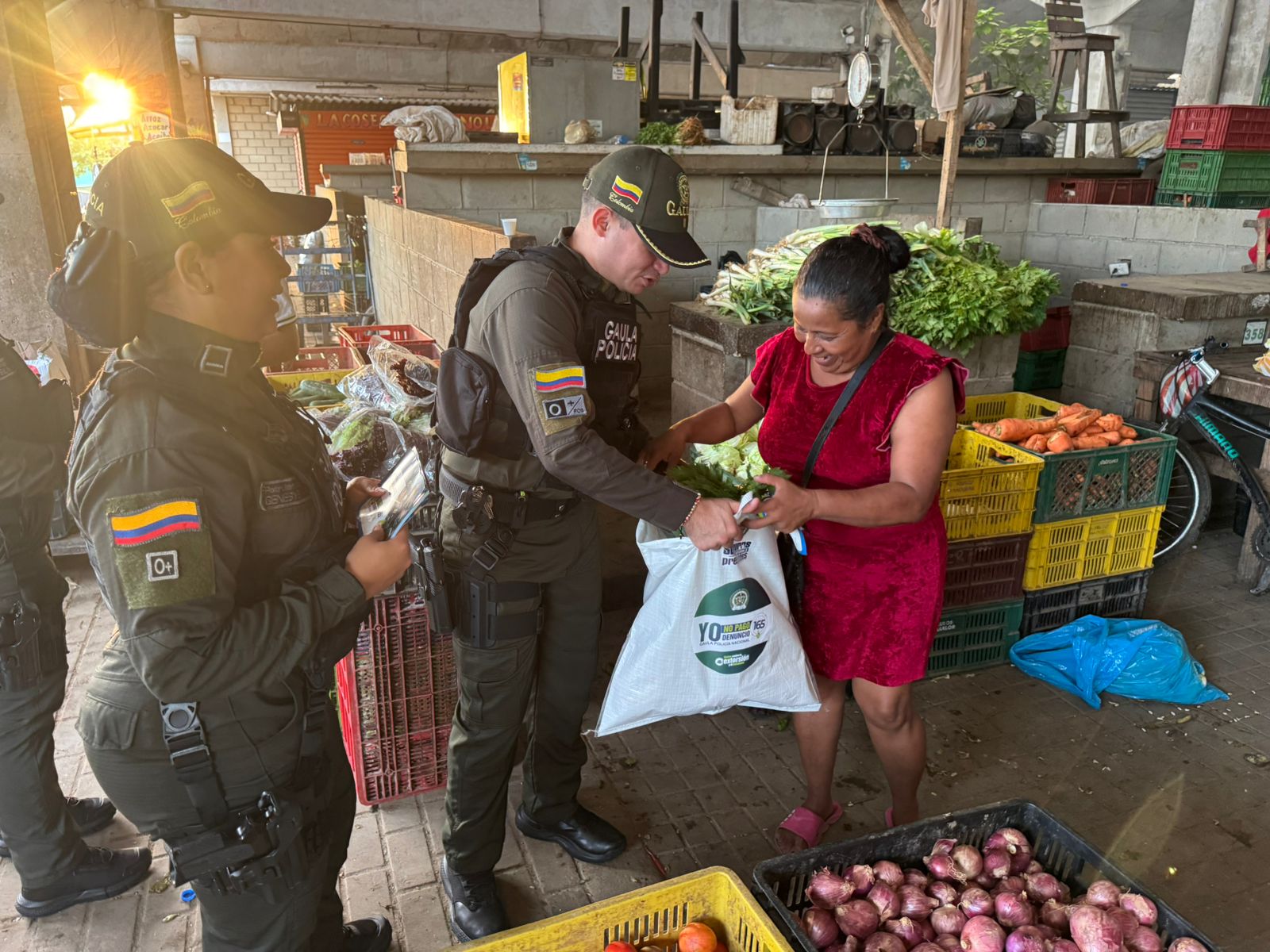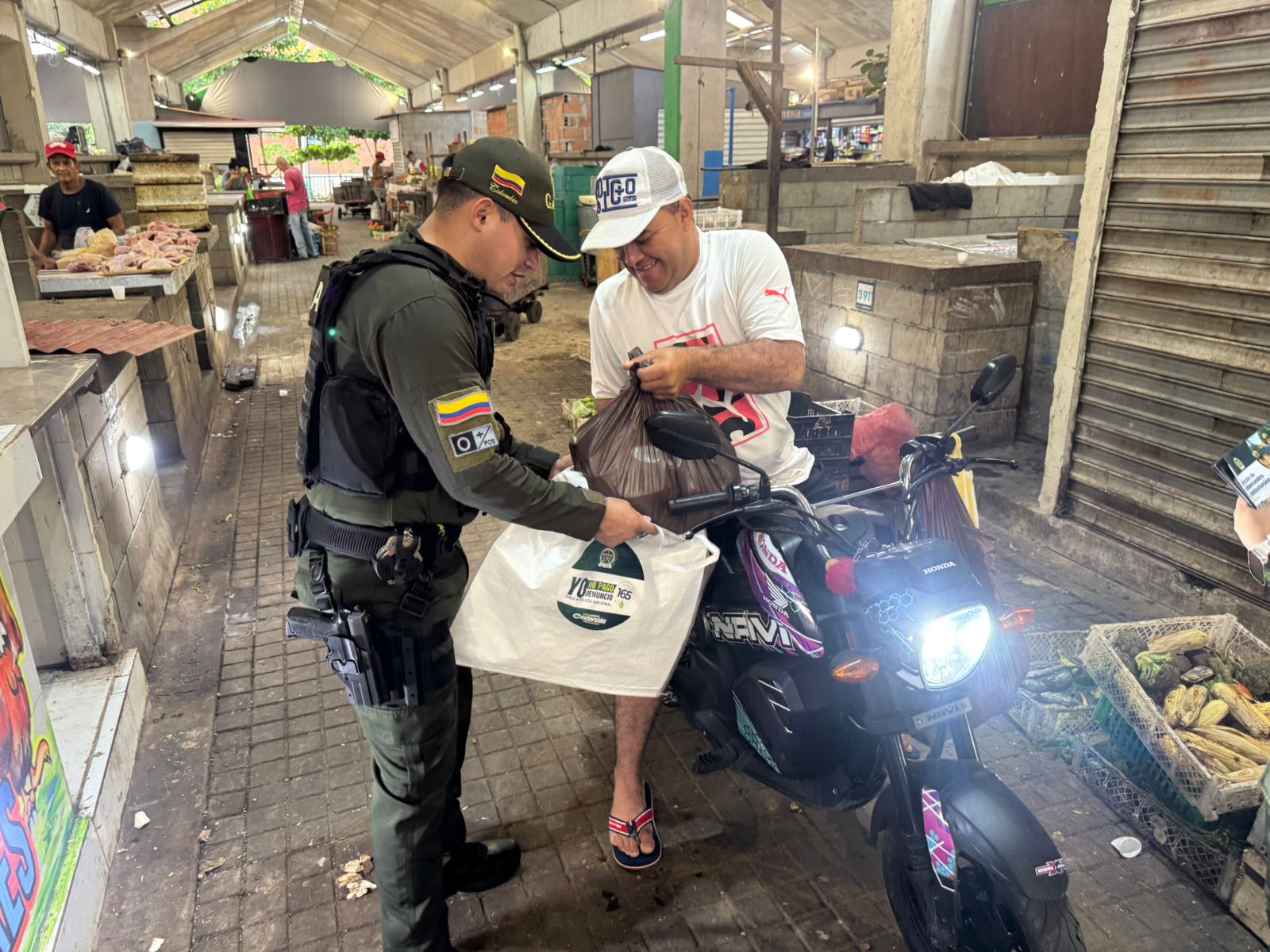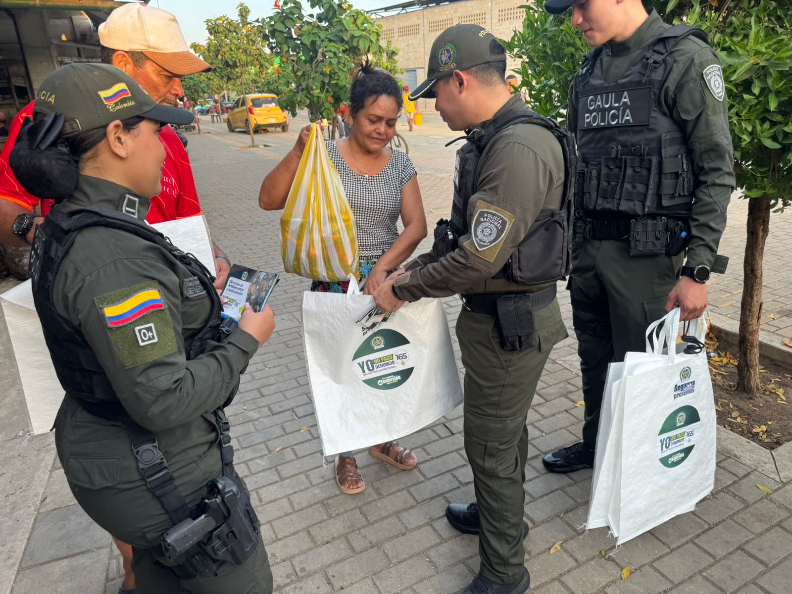 Durante la toma, los uniformados entregaron bolsas reutilizables a comerciantes y visitantes como símbolo de un mercado seguro y libre de intimidaciones. La jornada incluyó charlas pedagógicas en las que se socializaron las diferentes modalidades de secuestro y extorsión, además de brindar recomendaciones de seguridad y autoprotección para prevenir estos delitos.