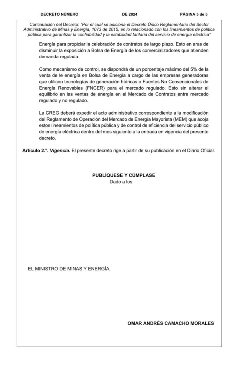 El Ministerio de Minas y Energía ha publicado un proyecto de decreto que busca establecer nuevos lineamientos en la política pública para garantizar la confiabilidad y estabilidad tarifaria en el mercado de energía eléctrica. Este borrador, disponible para comentarios, propone limitar al 5% la venta de energía en bolsa para el mercado regulado, afectando especialmente a las empresas generadoras que operan con fuentes hídricas y no convencionales de energía renovable.