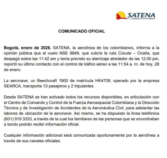 Satena informó que desde el primer momento activó sus protocolos internos de atención y acompañamiento, brindando apoyo a los familiares de los ocupantes. Por su parte, la Aeronáutica Civil indicó que la investigación para esclarecer las causas del accidente estará a cargo de los organismos competentes y que cualquier avance será comunicado exclusivamente a través de canales oficiales, con el fin de evitar desinformación.