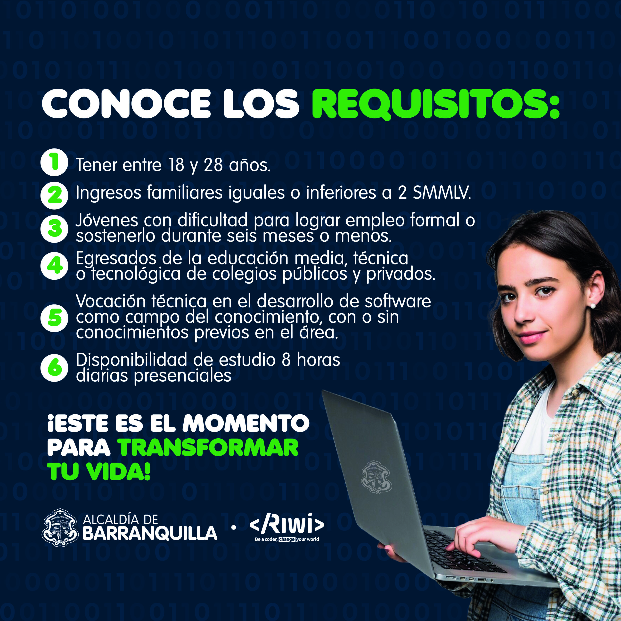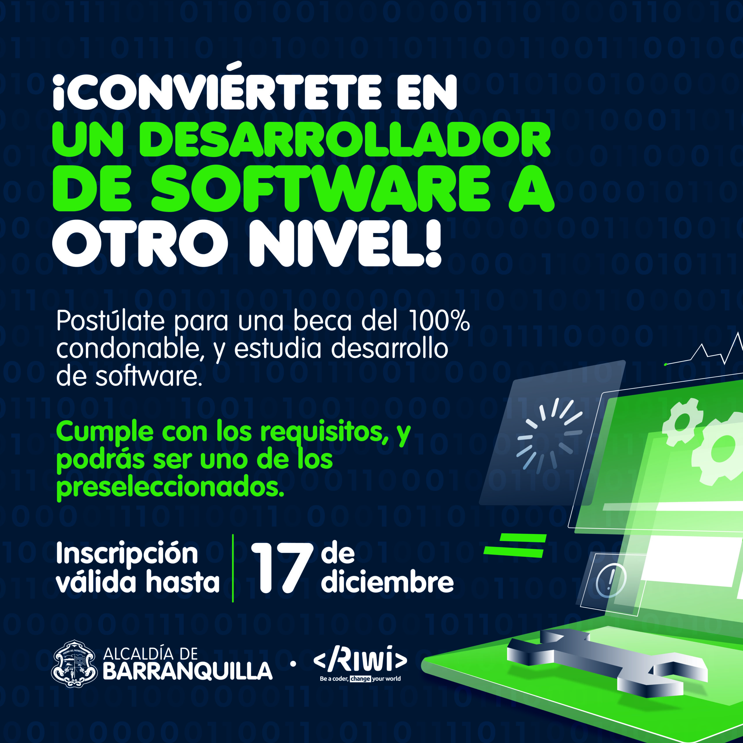 La Alcaldía de Barranquilla continúa otorgando herramientas para que jóvenes puedan acceder a una formación tecnológica e innovadora. En esta oportunidad, la Administración distrital, de la mano de Riwi, abre una convocatoria para que más de 200 jóvenes, que residan en Barranquilla, puedan convertirse en desarrolladores de software a otro nivel.