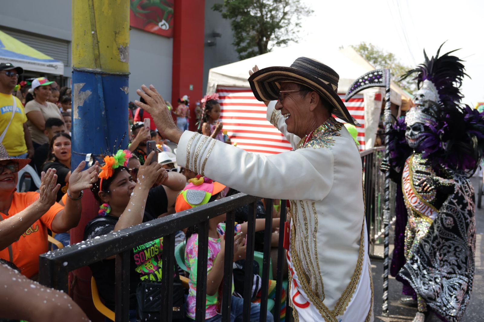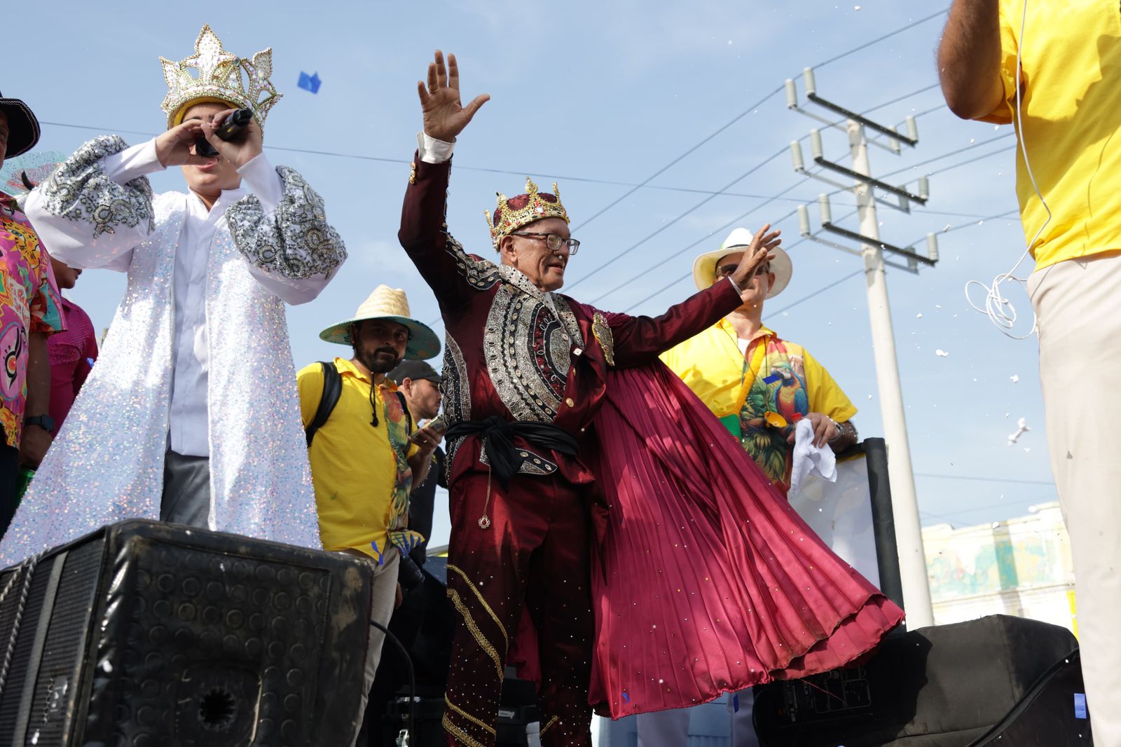 Uno de los momentos más emotivos de la jornada fue la participación del Rey Momo 2025, Gabriel Marriaga, y la Reina del Carnaval, Tatiana Angulo Fernández de Castro, quienes, lejos de mantenerse en sus carrozas, decidieron bajar y caminar junto a los asistentes, generando un ambiente de cercanía y alegría desbordante.