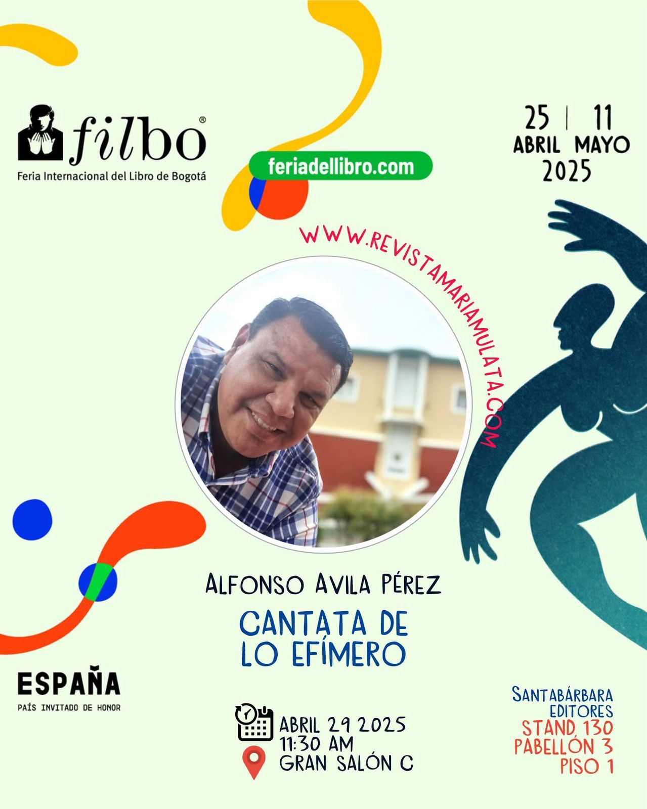 Como parte de las novedades editoriales, el director de la revista MaríaMulata y editor general de SantaBárbara Editores, lanza la segunda edición de su poemario Cantata de lo efímero, una obra que ha ganado eco en círculos poéticos por su estilo sobrio y evocador. A propósito de esta publicación, se distribuirá gratuitamente en el marco de la feria la edición número 90 de la revista MaríaMulata, dedicada como homenaje póstumo al escritor y gestor cultural Alfonso Ávila Pérez, fundador del Colectivo Poético MaríaMulata. Esta edición también estará disponible para descarga digital en el portal www.revistamariamulata.com.