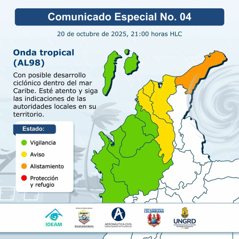 El Instituto de Hidrología, Meteorología y Estudios Ambientales (Ideam) anunció la elevación del nivel de alerta a alistamiento para el departamento de La Guajira, debido al fortalecimiento de la onda tropical AL98, localizada sobre el oriente del mar Caribe. De acuerdo con el más reciente reporte del Centro Nacional de Huracanes (NHC), este sistema presenta una probabilidad del 90 % de convertirse en ciclón tropical en las próximas 48 horas.