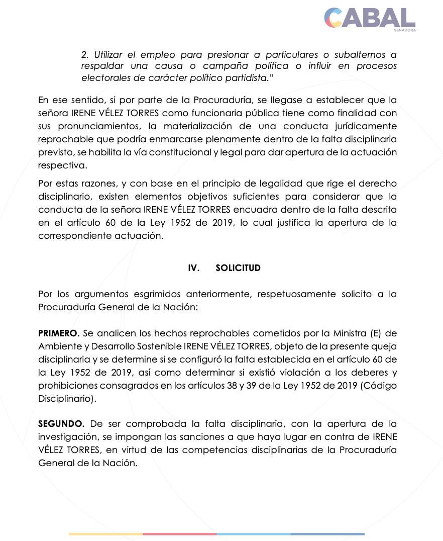 Cabal solicitó al Ministerio Público investigar a fondo los hechos y determinar si Irene Vélez incurrió en participación indebida en política. Además, reiteró que este tipo de actuaciones “socavan la institucionalidad, afectan la confianza ciudadana y representan un abuso del poder público con fines partidistas”.