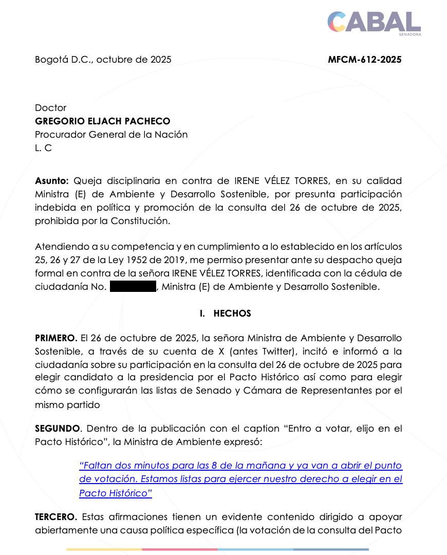 La senadora y precandidata presidencial María Fernanda Cabal radicó una queja disciplinaria ante la Procuraduría General de la Nación contra la ministra encargada de Ambiente y Desarrollo Sostenible, Irene Vélez Torres, por supuesta intervención indebida en política tras promover en sus redes sociales la consulta interna del Pacto Histórico realizada el pasado 26 de octubre.
