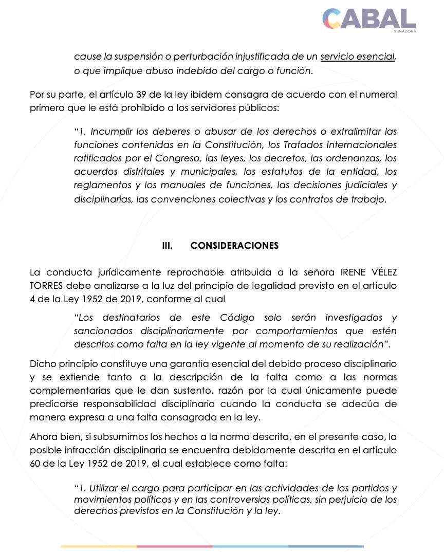 Según el documento presentado por Cabal, la publicación de Vélez constituye una presunta violación al Código General Disciplinario (Ley 1952 de 2019), en especial a los artículos 38, 39 y 60, que prohíben a los servidores públicos participar en controversias o actividades de carácter partidista utilizando su cargo o influencia institucional.
