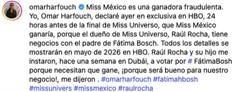 Por su parte, Omar Harfouch había anunciado en noviembre pasado su intención de emprender acciones legales contra la organización, asegurando contar con pruebas que respaldarían supuestas irregularidades en el sistema de votación del concurso.