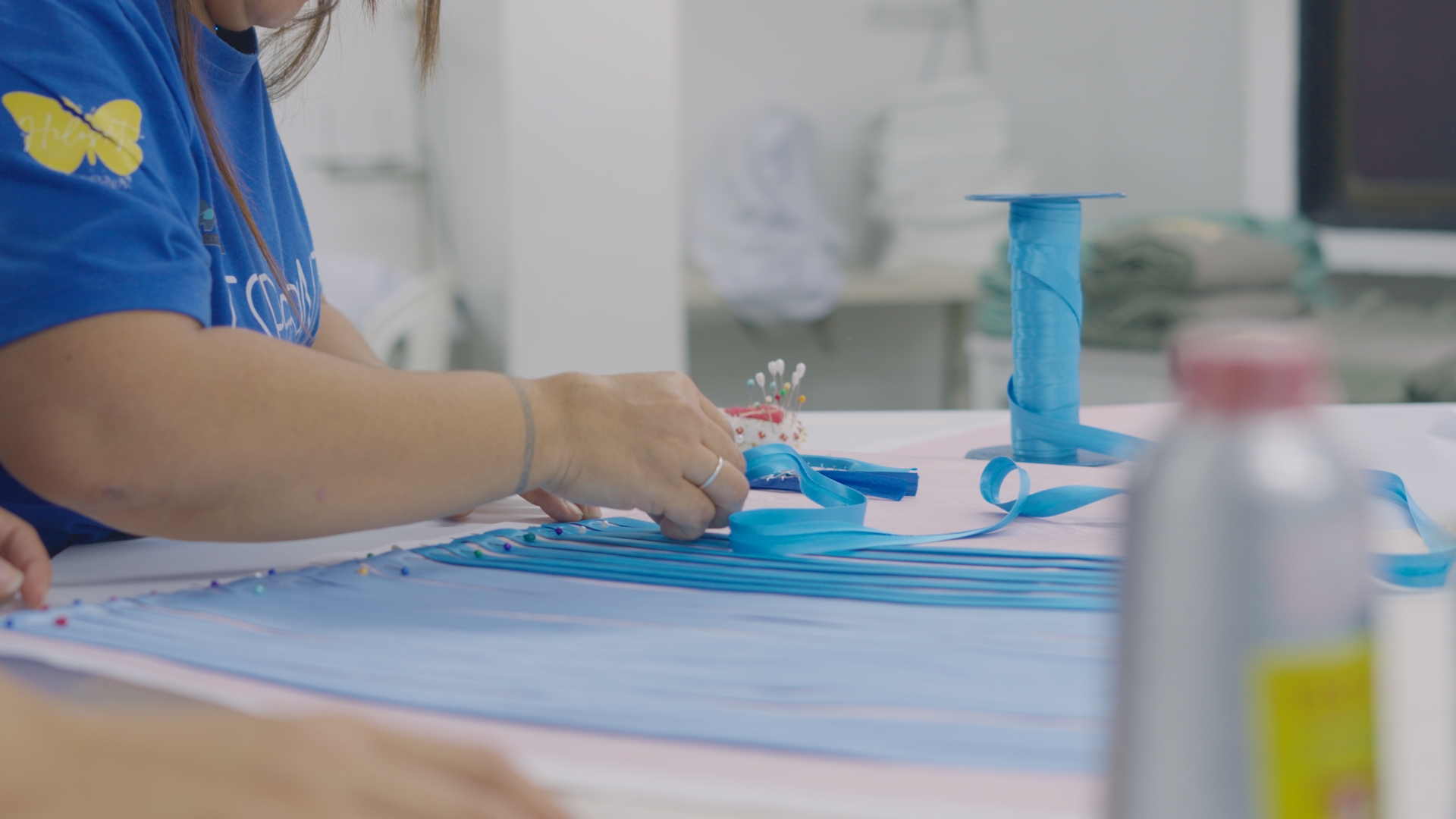 El corsé y el ensamblaje final estuvieron a cargo de 12 mujeres pospenadas que hacen parte de la Fundación Hilos de Fe, la primera planta de confección con sentido social en Latinoamérica, en alianza con la Arquidiócesis de Barranquilla. El resultado: una pieza totalmente hecha a mano, cargada de propósito.