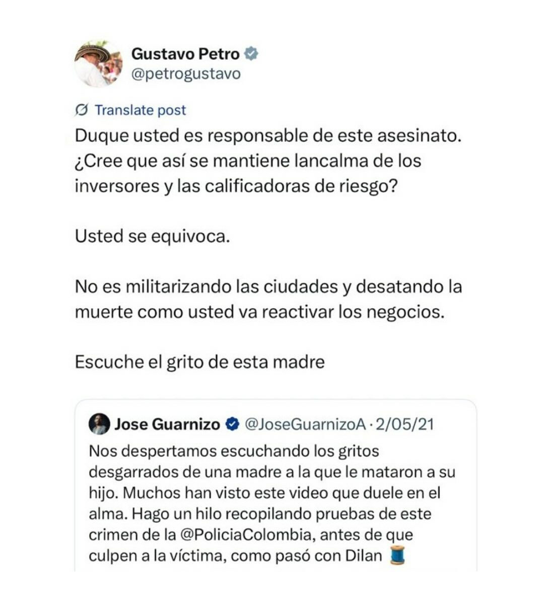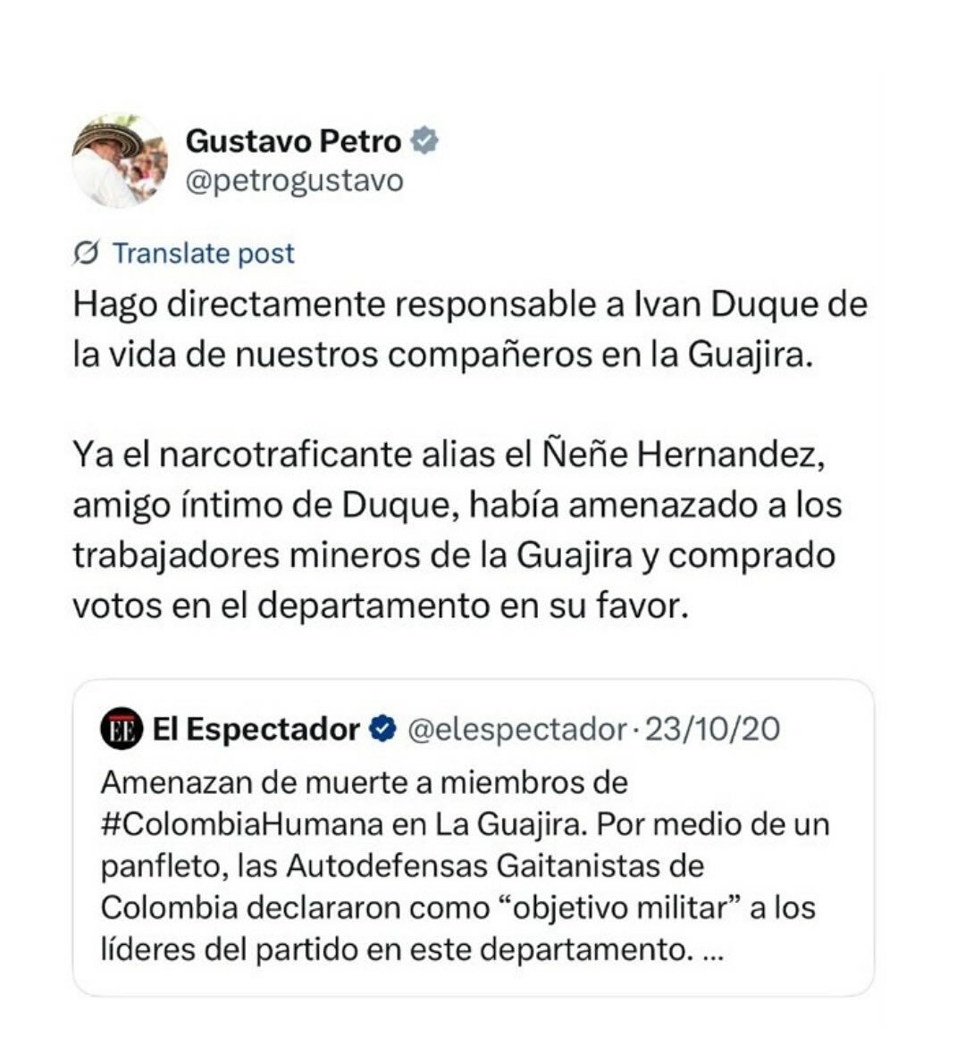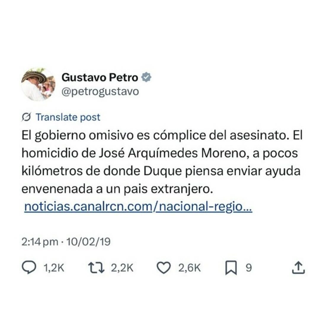 Sin embargo, las declaraciones generaron una ola de críticas en redes sociales, donde varios usuarios lo acusaron de “incoherencia” y “conveniencia”, recordando que durante el gobierno del expresidente Iván Duque, Petro lo llamó en repetidas ocasiones “asesino” y lo responsabilizó de situaciones como el atentado contra el líder indígena Feliciano Valencia, sin presentar pruebas.