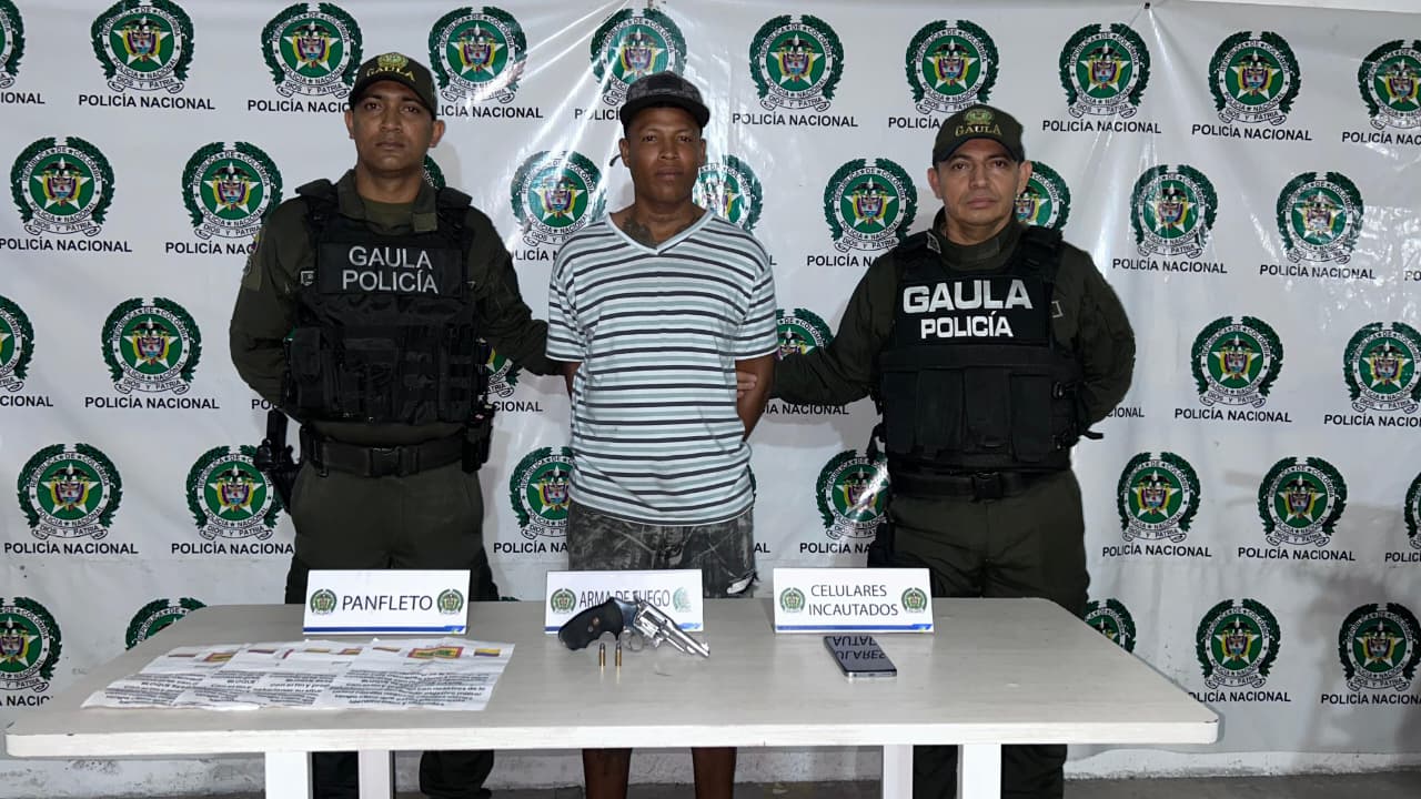 En una tercera acción, ejecutada en el barrio El Santuario, fue capturado en flagrancia un hombre conocido como alias “El Pitufo”, acusado de porte ilegal de armas de fuego. Este sujeto, con antecedentes por estafa y tráfico de estupefacientes, se dedicaba a distribuir panfletos y disparar contra locales que se negaban a pagar cuotas extorsivas. Al momento de su detención, se disponía a atentar contra un negocio. En el procedimiento se le incautó un revólver, un celular y cinco panfletos alusivos al grupo “Bloque de Resistencia Caribe (BRC)”.