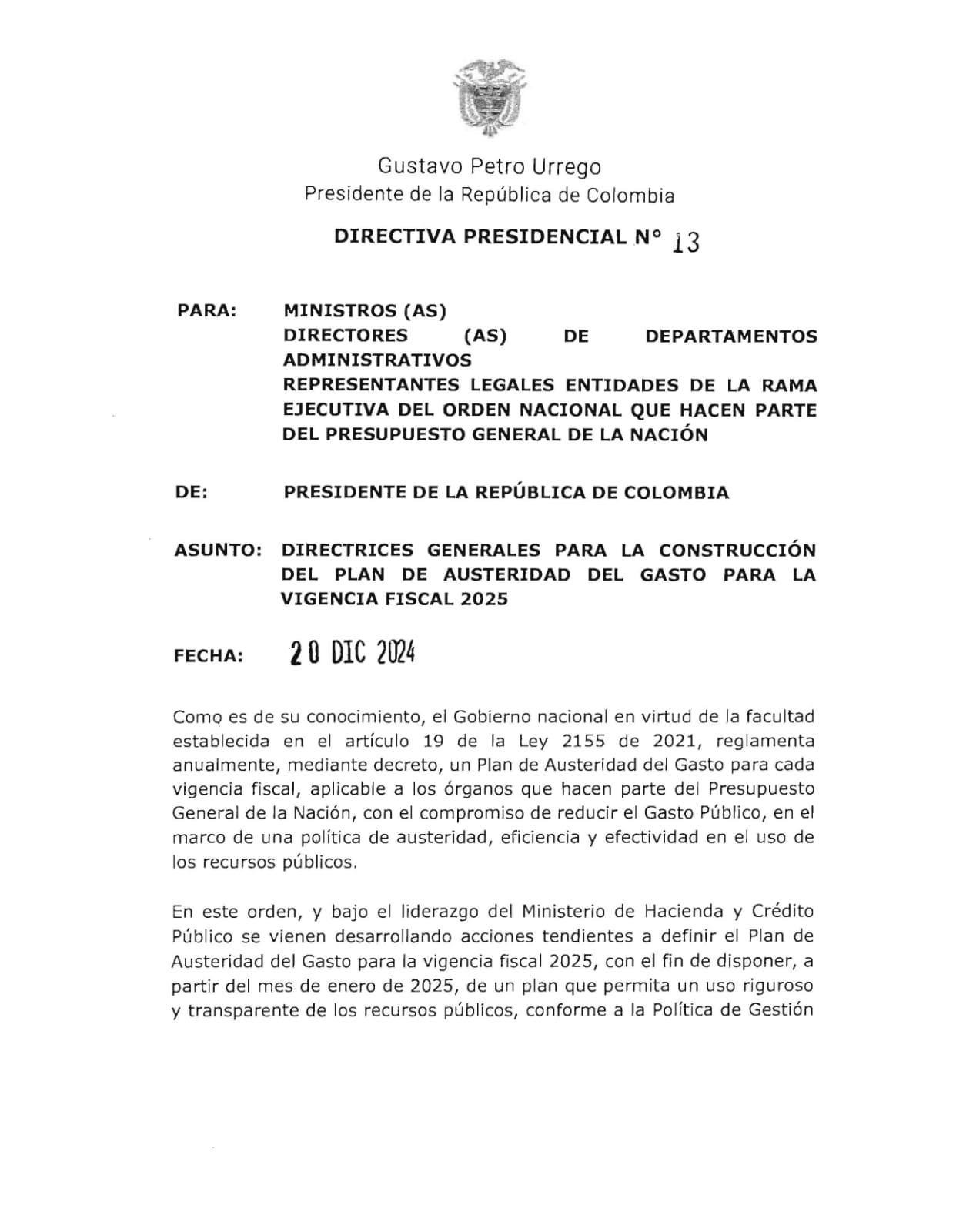 Con esta iniciativa, el Gobierno Nacional busca fortalecer la eficiencia del sector público y garantizar que los recursos se destinen de manera prioritaria a los programas esenciales, manteniendo la sostenibilidad fiscal en un contexto de incertidumbre económica.