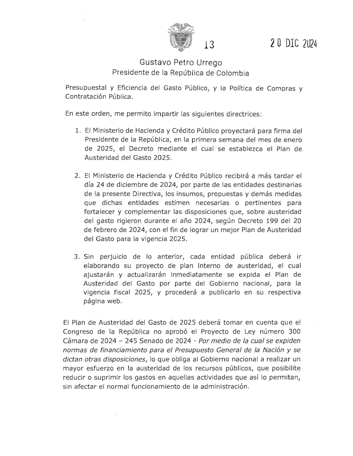El presidente Gustavo Petro firmará durante la primera semana de enero de 2025 un nuevo decreto de austeridad para regular el gasto público el próximo año. El Ministerio de Hacienda ya tiene proyectado el documento final del plan, que afectará a los órganos que hacen parte del presupuesto general de la Nación, en un esfuerzo por optimizar los recursos públicos debido a la falta de aprobación del proyecto de ley de financiamiento por parte del Congreso de la República.