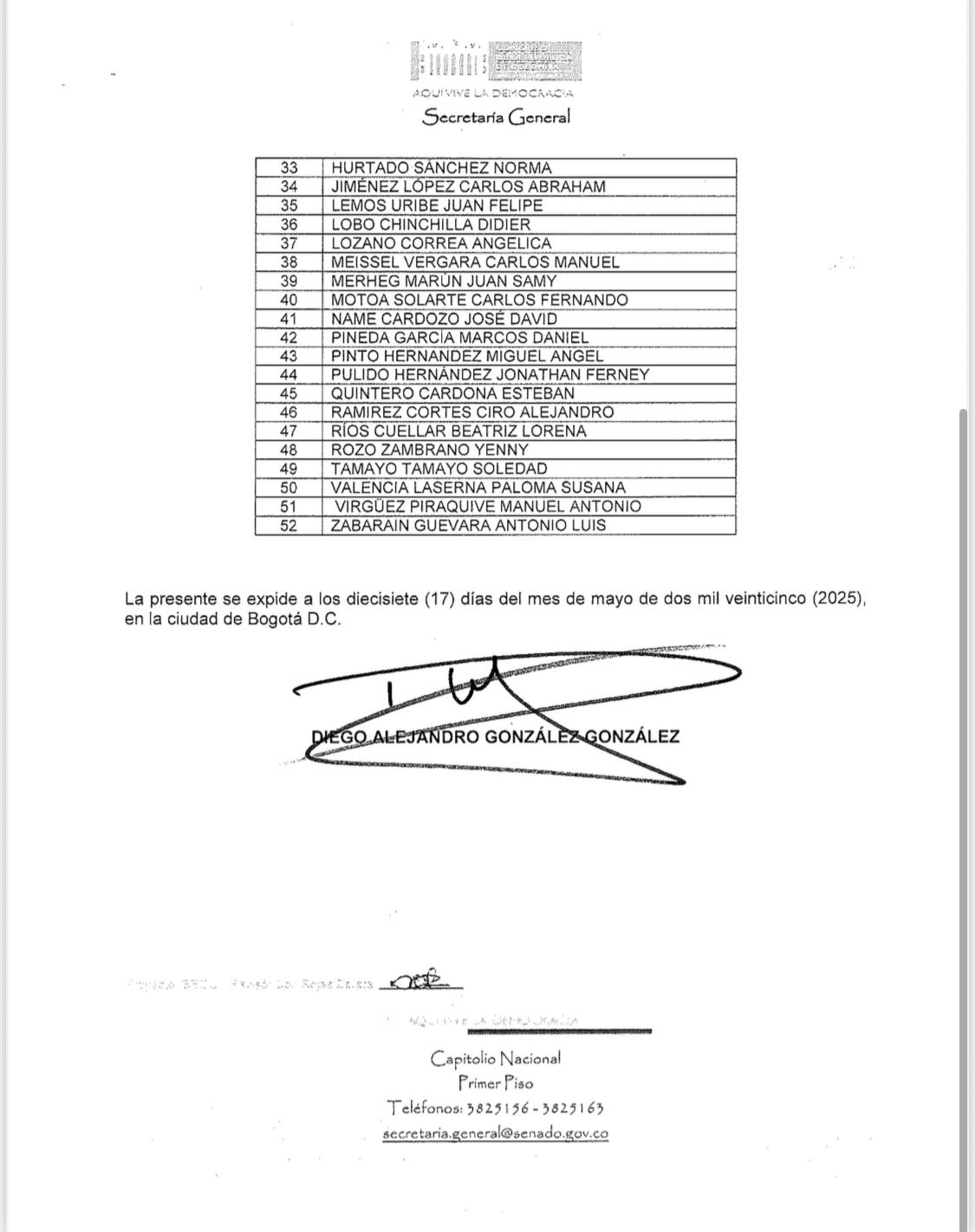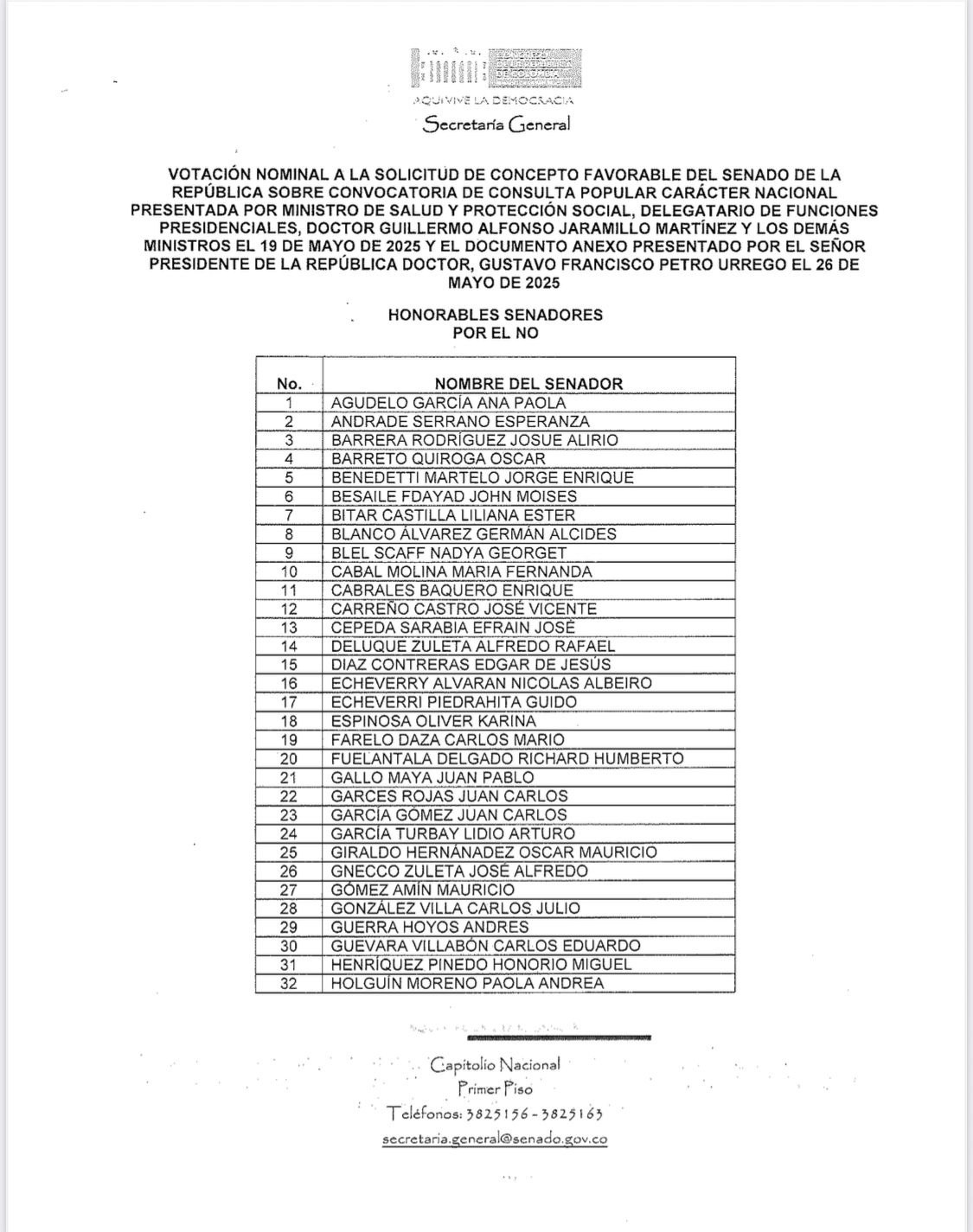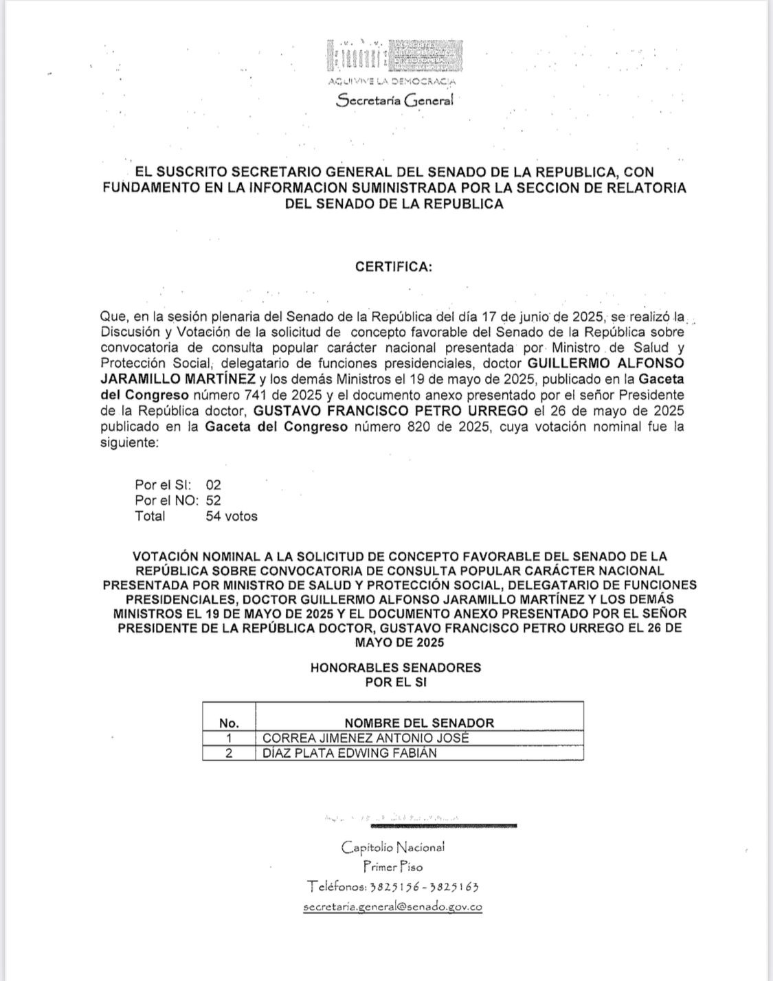 La decisión fue comunicada a través de una carta oficial enviada desde la mesa directiva del Senado, en la que se adjunta la certificación de la votación firmada por el secretario general Diego González. La carta deja constancia de que la sesión del 17 de junio cumplió con el quorum necesario, a pesar del retiro de la mayoría de la bancada oficialista que intentó evitar la votación.
