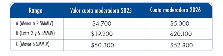En el régimen contributivo, las cuotas moderadoras seguirán dependiendo del nivel de ingresos del cotizante, medido en salarios mínimos legales mensuales vigentes. Para 2026, quienes ganen menos de dos salarios mínimos deberán pagar cerca de 5.000 pesos por concepto de cuota moderadora. Los afiliados con ingresos entre dos y cinco salarios mínimos asumirán un valor aproximado de 20.100 pesos, mientras que quienes superen los cinco salarios mínimos pagarán alrededor de 52.800 pesos.