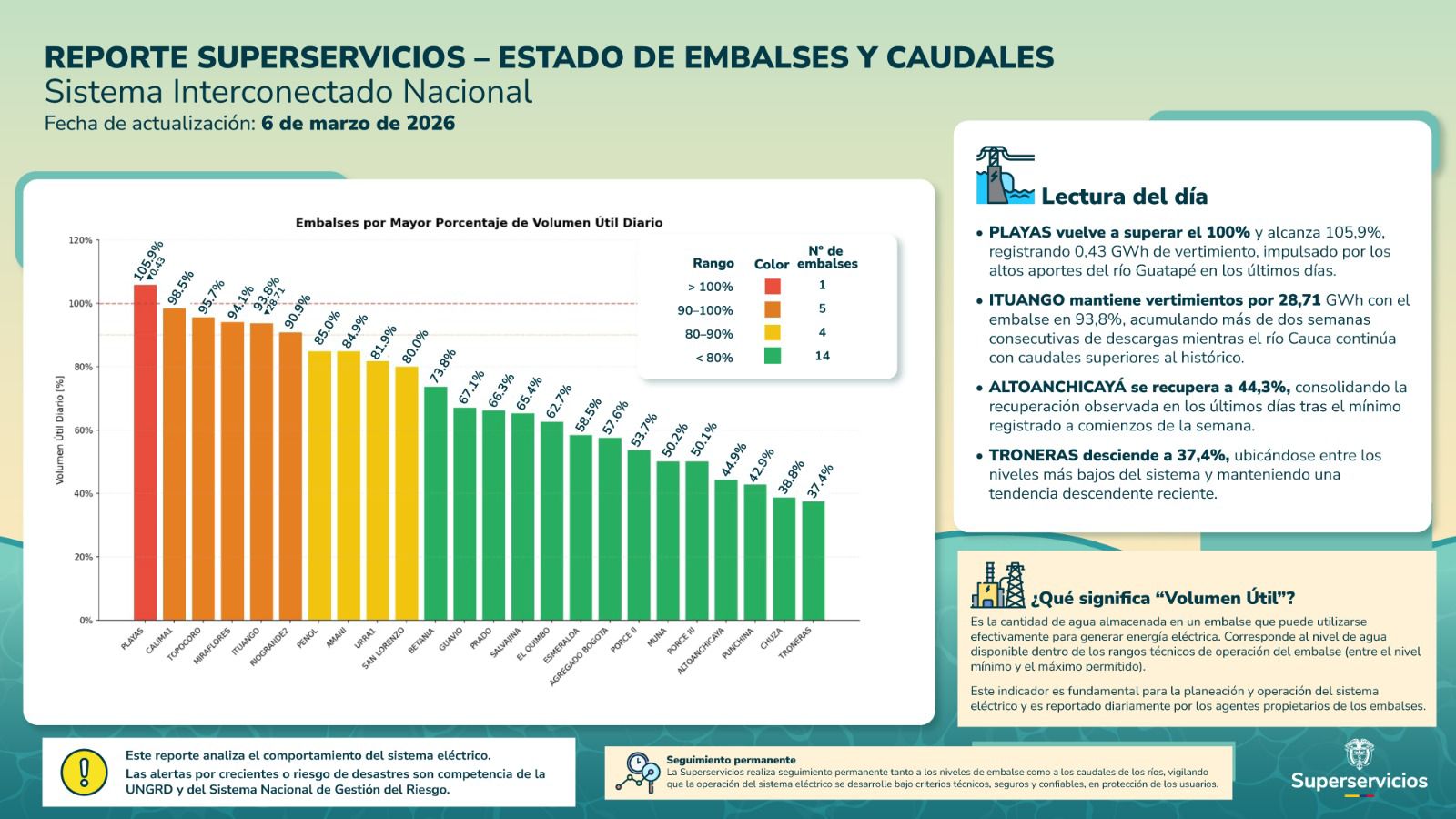 La Superintendencia de Servicios Públicos señaló que estos reportes hacen parte de las labores de inspección, vigilancia y control que la entidad desarrolla sobre el funcionamiento del sistema eléctrico nacional. El objetivo es garantizar que la operación de los embalses se mantenga dentro de parámetros seguros y confiables para el suministro de energía en el país.