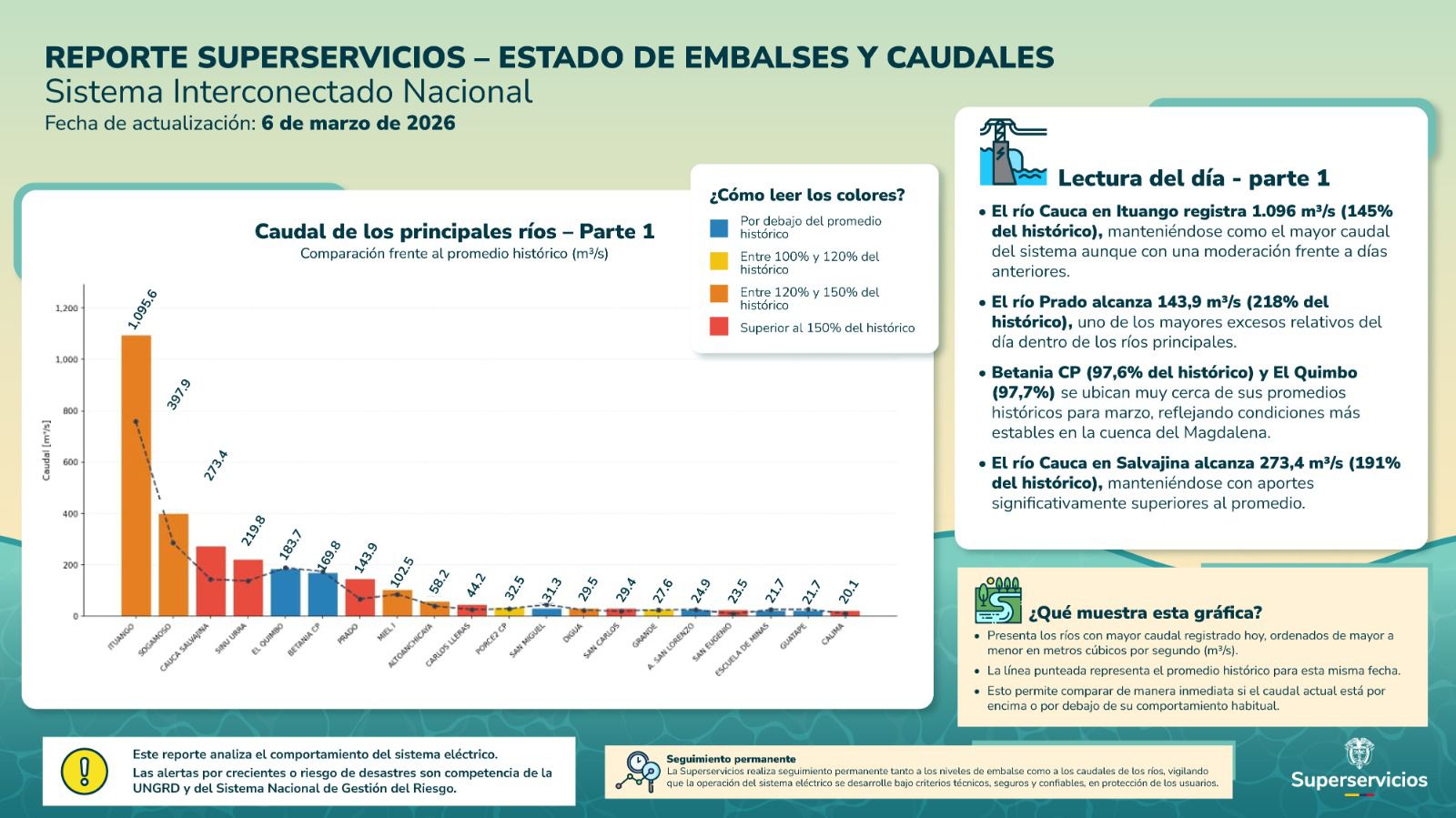El informe también analiza el comportamiento de los ríos principales que alimentan el sistema energético del país. En este sentido, el río Cauca a la altura de Ituango registra un caudal de 1.096 metros cúbicos por segundo, cifra que representa el 145 por ciento de su promedio histórico y que lo mantiene como el de mayor volumen dentro del sistema hídrico monitoreado.