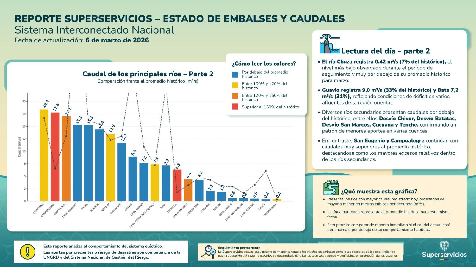 Mientras tanto, la Superservicios continuará realizando seguimiento técnico a la evolución de los embalses y al comportamiento de los ríos en distintas regiones del país, con el propósito de garantizar la estabilidad del sistema energético y proteger los intereses de los usuarios del servicio público de energía.