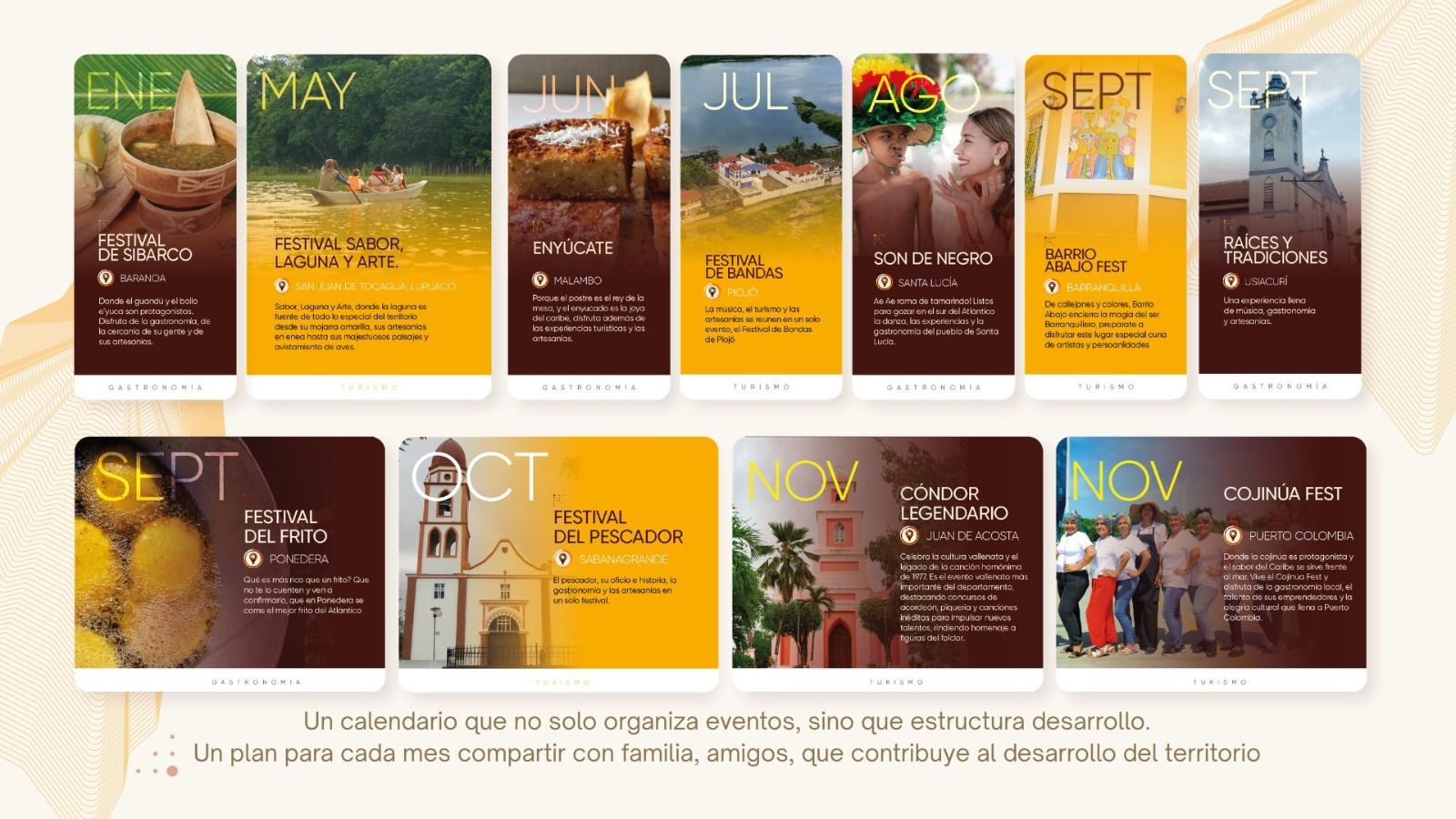 La agenda de eventos para 2026 comenzará con el Festival de Sibarco en el municipio de Baranoa y continuará con una serie de celebraciones que resaltan las tradiciones y la diversidad cultural del territorio. Entre los eventos programados se encuentran Sabor, Laguna y Arte en San Juan de Tocagua en Luruaco, Enyúcate en Malambo, el Festival de Bandas en Piojó y el Festival Son de Negro en Santa Lucía.