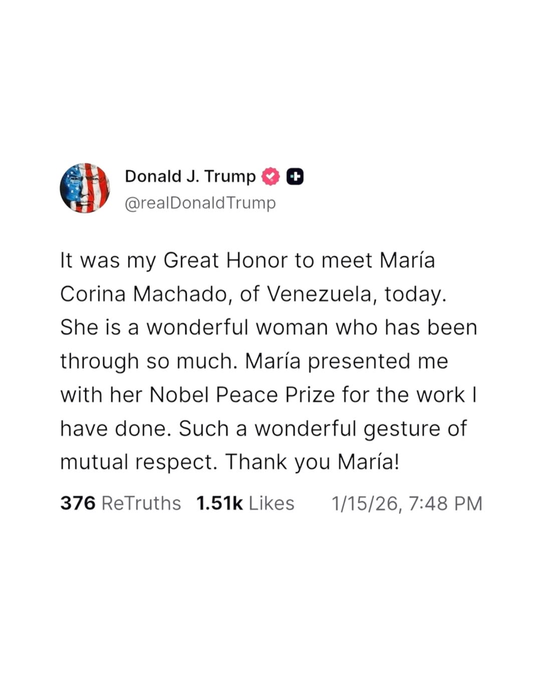 La declaración fue hecha por el mandatario estadounidense a través de su red social Truth Social, donde calificó el encuentro como un honor y elogió a la dirigente venezolana. En su mensaje, Trump señaló que Machado es una mujer admirable, marcada por una larga trayectoria de lucha política, y afirmó que la entrega de la medalla representó un acto de respeto mutuo por el trabajo que, según él, ha realizado en favor de la libertad del pueblo venezolano.