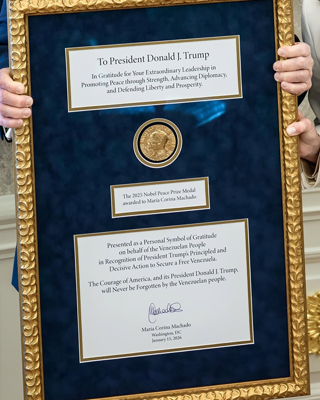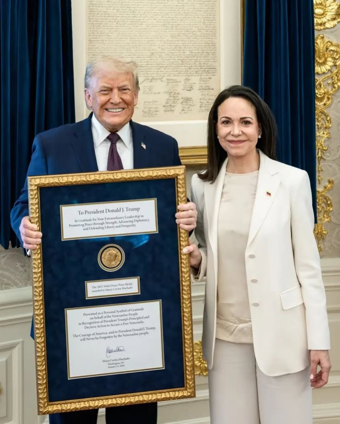 Machado señaló que, así como Bolívar conservó aquella medalla durante toda su vida como emblema de la libertad, hoy el pueblo venezolano quiso corresponder ese gesto histórico ofreciendo al heredero del legado de Washington un símbolo de gratitud por su respaldo en la lucha democrática. Según explicó, la entrega de la medalla del Nobel representa un reconocimiento al compromiso que ella considera determinante para la causa venezolana.